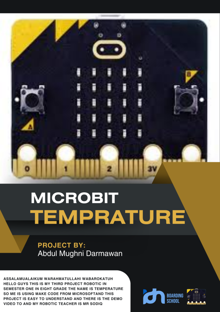 assalamualaikum warahmatullahi wabarokatuh Hello Guys This Is My third Project robotic In Semester one in eight grade The Name is temperature so me is using make code from microsoftand this project is easy to understand and there is the demo video to and my robotic teacher is mr sodiq