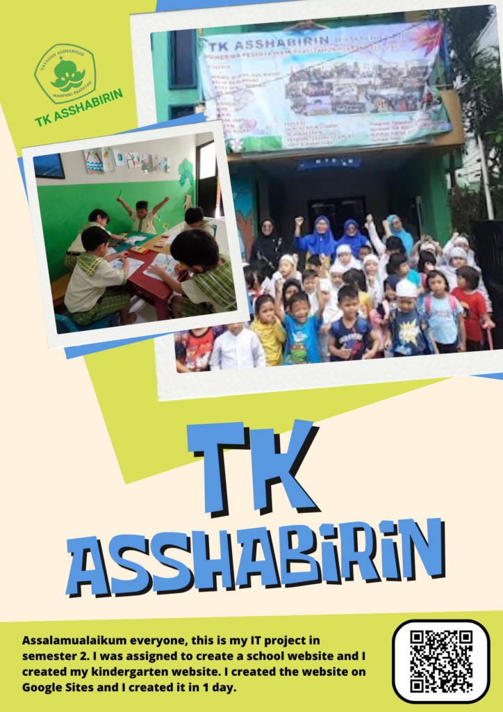 ASSALAMUALAIKUM EVERYONE, THIS IS MY IT PROJECT IN SEMESTER 2. I WAS ASSIGNED TO CREATE A SCHOOL WEBSITE AND the name of the school is tk asshabirin and this school is MY KINDERGARTEN so i make the website of my kindergarden . I CREATED THE WEBSITE ON GOOGLE SITES AND I CREATED IT IN 1 DAY. and my it teacher is mr angga